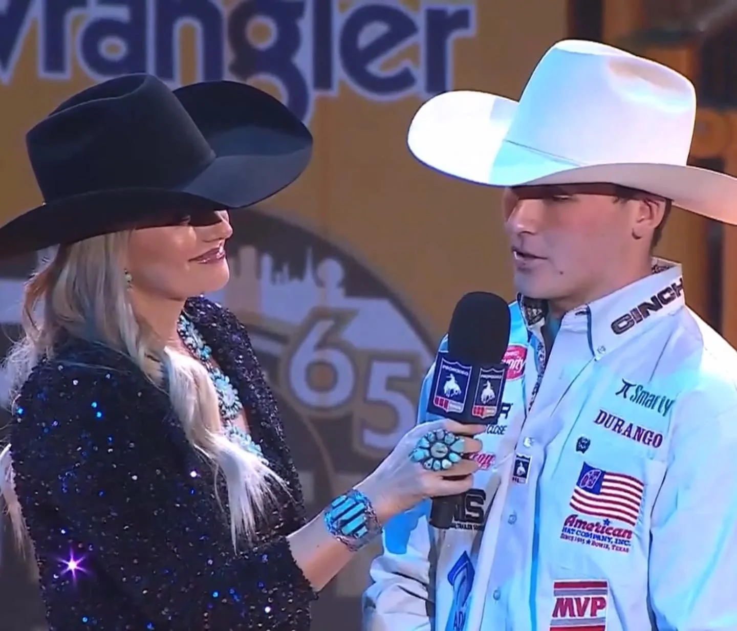 Amy Wilson’s time at the NFR didn’t end when she passed on her Miss Rodeo America crown. She went on to become one of the most recognizable faces in professional rodeo as a western sports reporter for The Cowboy Channel. She is shown here interviewing world champion tie-down roper Riley Webb after he won his world championship.