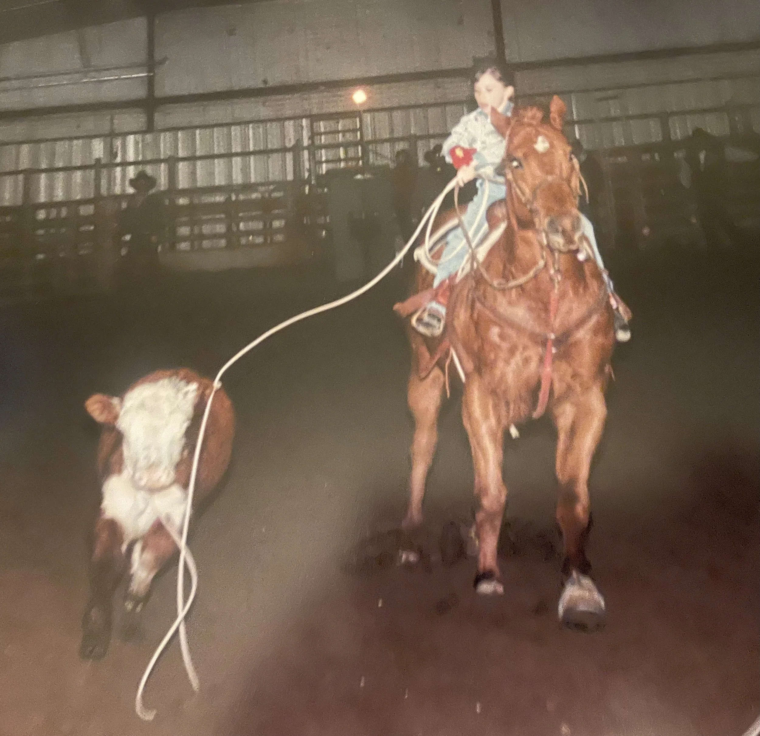 Kelsie Chace-Domer at age 8 roping on her horse Bozo at a junior rodeo in Kingman, Kansas.
